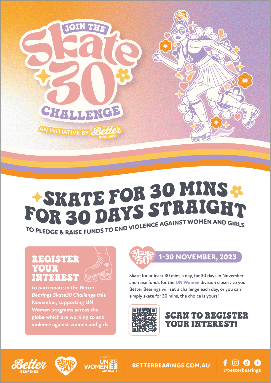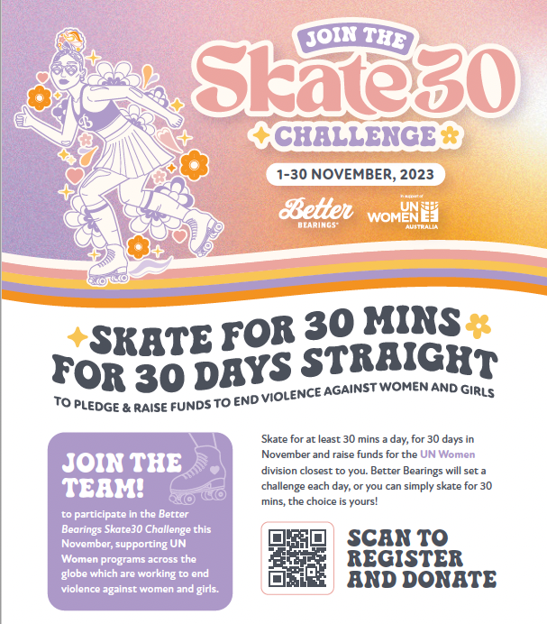Share your progress and inspire others to join by using the hashtags #BetterBearingsSkate30 #unwomenaus #skate30_challenge #endgenderbasedviolence on social media. Let's skate together towards a world free from gender-based violence.